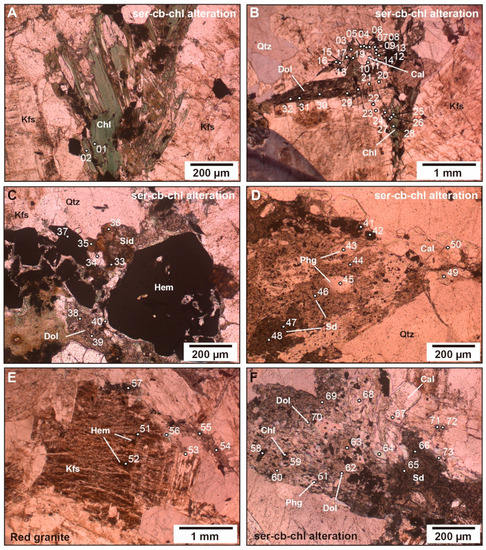 Thin section photomicrographs of SCC alteration minerals of the Passa Três granite analysed by EPMA: (A) Chlorite replacing magmatic biotite; (B) Mafic aggregate in red granite formed by biotite and altered amphibole; analytical points indicate the presence of clinochlore, siderite (Fe(Mg) carbonate), Fe-dolomite (Ca-Mg-Fe carbonate), and calcite as alteration minerals; (C) Fe-dolomite (Ca-Mg-Fe carbonate) and siderite (Fe(Mg) carbonate) as alteration in the red granite; (D) Relic sphene crystal altered to siderite (Fe(Mg) carbonate), phengite, Fe-dolomite (Ca-Mg-Fe carbonate), and rutile, SCC alteration; (E) K-feldspar with Fe-oxide exsolution as indicated by the presence of FeO in the EPMA analysis; (F) Biotite replaced by clinochlore, calcite, Fe-dolomite, siderite, sericite (phengite), with indication of the points of analyses. Images (A–F): optical microscope—natural light. Abbreviations: Cal—calcite; Cb—carbonate; Chl—chlorite; Dol—Fe-dolomite; Hem—hematite; Kfs—K-feldspar; Phg—phengite; Qtz—quartz; Sd—siderite; Ser—sericite.