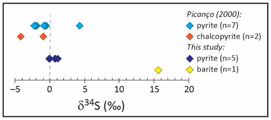 Sulphur isotope data (δ34S, ‰) were collected on five samples of pyrite and one sample of barite from the gold mineralisation at Passa Três granite. Results are reported in the Supplementary Material G (Figure S10). Pyrite crystals display δ34S values in the restricted range between −0.1‰ and 1.1‰, which is consistent with a magmatic origin for sulphur, and possibly with mantle contribution, indicating a very deep source. Additionally, the barite sample displays a δ34S value of 15.6‰, which is also typical for sulphates precipitating from magmatic fluids. These results are coherent with δ34S analyses from earlier work (Figure 14; [16]) and other geochemical data for the Passa Três granite, which is interpreted as indicating mantle origin for the magma [15].