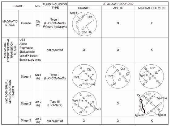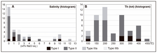 Fluid inclusions were studied in mineralised quartz veins cropping out at levels 4 and 5 in the underground mine and also from the surrounded granite and associated aplitic dikes. Quartz is the main mineral of the gangue in which gold is associated with pyrite. Many of the collected samples do not contain abundant fluid inclusions of size suitable for microthermometric measurements (difficulty also reported by Piekarz [15] and attributed to the late brittle deformation of the orebodies), but a few samples were selected for further investigation. Unfortunately, fluid inclusions from the early hydrothermal veins (veins with K-feldspar borders) were too small in size and thus not analysed. Using the petrographic criteria of Roedder [55], the fluid inclusions analysed have been classified as primary and secondary. Fluid inclusion assemblages (FIA) have been defined according to the criteria of Goldstein and Reynolds [56] prior to microthermometry analysis. In an FIA, fluid inclusions are cogenetic and trapped at the same time and are representative of the same fluid. Microthermometric data are summarised in Table 1 and presented in Figure 15, Figure 16, Figure 17, Figure 18 and Figure 19.