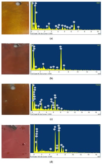 The inhibition of the corrosion of the mild steel and 304 SS after exposure to a solutions without and with 0.5% wt. (m/v) concentration of , , , and inhibitors was examined at room temperature (approximately 25 °C) using weight-loss measurements. After 45 days of immersion in each inhibited solution, the average corrosion rates were calculated and are presented in Table 2. Whereas all four corrosion inhibitors were only effective to a degree in reducing the corrosion rate of mild steel in the 3.5% NaCl solution, they were 100% effective in stopping any corrosion of the stainless steel. There was not much difference in the degree of protection of the mild steel with a change in the metal ion in the complex of the inhibitor, or the β-diketone complex. A visual inspection of the coupons that were immersed in a solution containing , , , and showed a brownish deposit, presumably a rare-earth oxide or hydroxide covering the surface of the coupon. The colour of the coupons remained intact after being washed with de-ionised water and rinsed with acetone. EDX analysis revealed that the colour of the coupons could have been due to a corrosion product film, which predominantly contained the rare-earth element compounds used as inhibitors. EDX spectra are shown in Figure 2. This observation had been reported by several authors using REE compounds, who all concluded that the observed colour on the surface of the investigated specimens in the presence of REE compounds was a result of the formation of a rare earth oxide on the surface of the coupons [26,27,28,29,30,31].