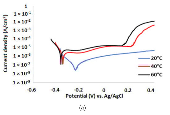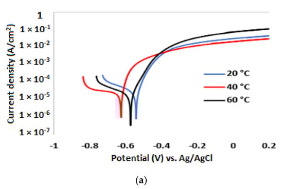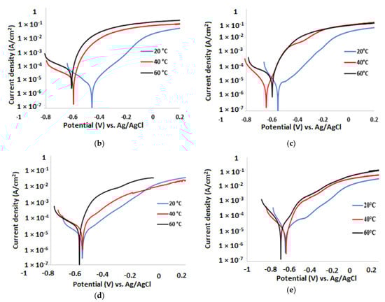 The potentiodynamic curves of the mild steel for all the tested temperatures and corrosion inhibitors in the 3.5% NaCl solutions are shown in Figure 3, while the corresponding test results with 304 SS under similar conditions are displayed in Figure 4.