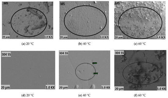 SEM micrographs of uninhibited (a–c) MS and (d–f) 304 SS sample surfaces obtained after exposure to 3.5% NaCl solution at 20 °C, 40 °C, and 60 °C.
