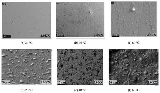 SEM micrographs of inhibited mild steel sample surfaces with (a–c) and (d–f) obtained after exposure to 3.5% NaCl solutions at 20 °C, 40 °C, and 60 °C.