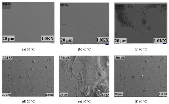 SEM micrographs of 304 SS sample surfaces inhibited with (a–c) and (d–f) obtained after exposure to 3.5% NaCl solutions at 20 °C, 40 °C, and 60 °C.