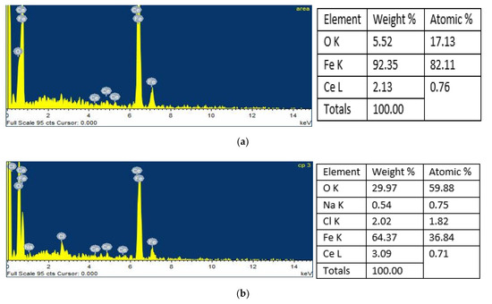 Amadeh et al. [37] used a mixture of RE oxide (Ce and La) as a corrosion inhibitor for carbon steel in 0.6 M NaCl solutions. SEM and EDS analysis of the nature of the deposit formed on the surface of the tested sample revealed that the sample was covered with a layer of corrosion products consisting of particles with irregular shapes containing cerium (Ce) and iron (Fe) deposits.