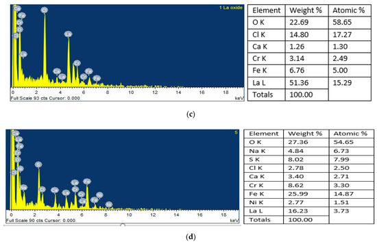 Figure 7, Figure 8, Figure 9 and Figure 10 show the SEM images of MS and 304 SS working electrodes before and after exposure with and without the REE β-diketone inhibitor complexes at 20 °C, 40 °C, and 60 °C. As the temperature of the solution containing , , and inhibitors increased to 60 °C, the surface morphologies of both MS and 304 SS changed compared to the ones retrieved at lower temperatures under the same conditions and similar environments. Analysis with EDS (Figure 11) on the MS and 304 SS electrode surfaces that were exposed to solutions that contained , , and revealed the formation of RE oxide and iron oxide containing films. These indicated that the main elements present in the corrosion product films were Ce or La, and Fe and O on the surfaces of MS and 304 SS electrodes. The observed results are in agreement with other authors’ observations based on the use of REE compounds as corrosion inhibitors for different alloys [8,11,36].