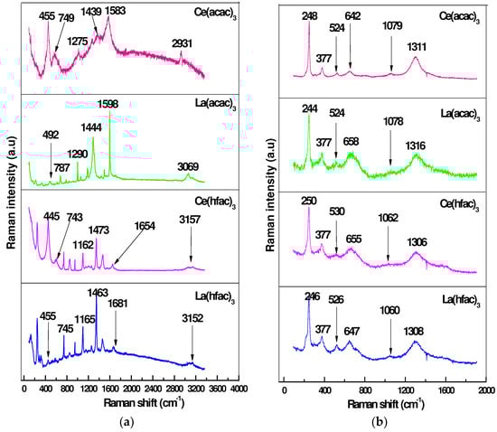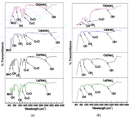Chemical structures of (a) metal acetylacetonate and (b) metal hexafluoroacetylacetone, where M = Ce or La, modified from [24].