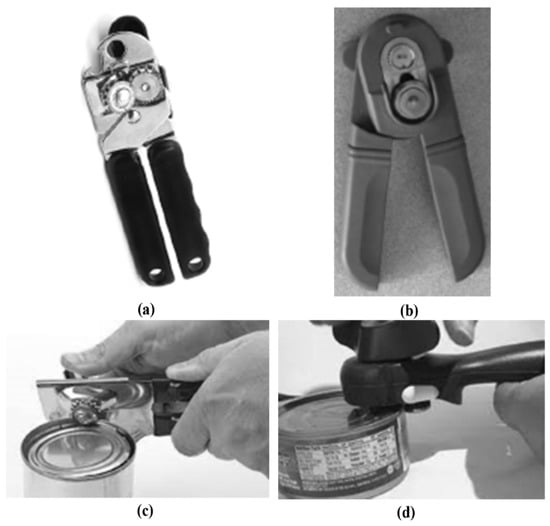 Figure 1. Design and use of a side cutting can opener (a,c) and a top cutting opener (b,d). Modified after (a) Evan-Amos, Public domain, via Wikimedia Commons, (b) © Materialscientist at English Wikipedia, CC BY-SA 3.0 https://creativecommons.org/licenses/by-sa/3.0 (accessed on 1 February 2022) via Wikimedia Commons, (c) © Whitestar1955|Dreamstime.com https://koit.com/96-5-koit-blog/youve-using-can-opener-wrong-whole-time/ (accessed on 1 February 2022), (d) © Susan Brown https://www.youtube.com/watch?v=zePEyRB6Hqo (accessed on 1 February 2022).