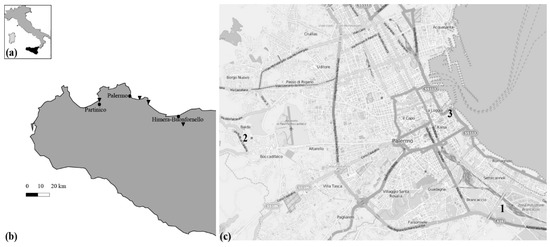 Figure 2. Map of Italy (a); western Sicily with the site discussed (b) (black dots: site sampled, black triangles: geological deposits sampled); and map of Palermo (c), with the sites discussed in the text. 1: Castello della Favara in Maredolce, 2: Convento di Baida, 3: Palazzo Steri–Chiaramonte.