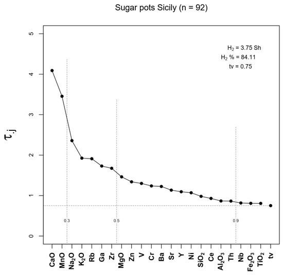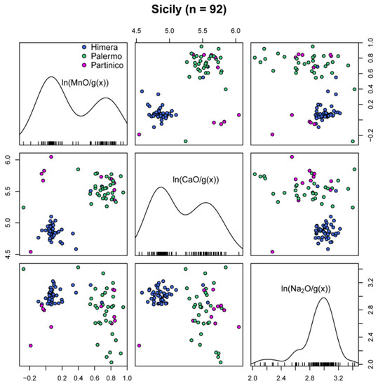 The statistical treatment was performed on 88 archaeological individuals (HIM015, 029, 070, 072, 146 were removed as only major and minor elements were measured) and the four geological deposits, for a total of 92 individuals. The statistical data treatment of the chemical data was performed on the retained values using R [82], and the first step was to measure the existing variability in the dataset. This variability results from the difference in the chemical data, and how evenly the chemical differences relate to the retained components [51,83]. In this case, total variation (tv = 0.75) was higher than expected for a monogenetic set [84]. Focusing our attention on the compositional evenness graph (Figure 4), most of the variability is linked to the relative concentrations of CaO, MnO (tv/τ.j < 0.3), and to a lesser extent, to Na2O, K2O, Rb, Ga, and Zr (0.3 < tv/τ.j < 0.5). The compositional evenness was measured according to information entropy (H2), also known as the Shannon index [85], on the τ.j values in decreasing order [51]. Looking at the scatterplot matrix using the three clr-transformed components that introduce more variability, CaO, MnO, and Na2O (Figure 5), the distribution of samples into two groups seems clear; one of these corresponds to the samples recovered from Himera–Buonfornello, and the other from the different sites in Palermo. In addition, the plot ln(CaO/g(x)) vs. ln(MnO/g(x)) also shows a few samples placed together that may form a small group related to Partinico.