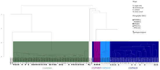 The second group related to Palermo, CGPAL02, is the second-largest group identified in this study, formed by 31 individuals. Their diffractograms show up to eight fabrics indicating a wide range of EFT from <800 °C to >950/1000 °C (Table 4). The F1 (STE011, 013, 014, PAR005) and F2 (STE003, MAR005 and PAR004) exhibit the same mineral phases: illite-muscovite, quartz, calcite, and plagioclase, with the exception of hematite, which is only present in F2 (Figure 12d, PAR004). In both cases, only the illite-muscovite peak of 4.5 Å is visible, a fact that might lead us to think about the decomposition of primary minerals of clay and calcite and the crystallisation of firing phases. According to the mineralogical characterisation of other Ficarazzi formation deposits [41], these are not as rich in illite-muscovite as in other clays and therefore the development of illite-muscovite peaks may not be an explanation for firing temperature changes. In addition, the presence of the peak of calcite, which is prominent in both fabrics, cannot be used for the estimation of a low EFT; PE indicates that almost all these individuals show the presence of calcite recrystallised after firing. In the samples examined by SEM from these two fabrics, a similar microstructure can be observed: STE011 and 014 are generally NV but with a few spots showing IV; PAR004 shows an NV core and IV margins (Figure 13g). According to these observations, an EFT ~800 °C is estimated. The next three fabrics, F3 (STE012, PAR007, 008, 010, and 011), F4 (STE001, 002, 005, 006, 008, 009, 016, BAD004, MAR001, 004, 007, and HIM174, 175), and F5 (MAR009) still show the peak of 4.5 Å of illite-muscovite, but now the clear crystallisation of gehlenite is observed for F3 together with an important development of plagioclase and hematite. Some individuals present an initial development of pyroxenes, clear for F4 (Figure 12d, HIM174) and more developed for F5, a fabric in which gehlenite is not present. All the individuals from these three fabrics present a peak of calcite to a greater or lesser extent. Consequently, an EFT >850 °C is clear for the three fabrics and an EFT around 950/1000 °C can be estimated for F4 and F5. SEM examination allows this temperature to be increased to the 950–1100 °C range; PAR011 from F3 shows a Vc microstructure with some areas at the core showing an advanced state of Vc+; both individuals from F4 (BAD004, HIM174) show dense vitreous masses (TV, Figure 13h), whereas individual MAR009 has an over-vitrified microstructure. Finally, three more fabrics were identified: F6 (MAR003 and MAR010), F7 (STE010), and F8 (MAR002), which would be clearly fired above 950/1000 °C. None of the individuals from these fabrics show the presence of the illite-muscovite peaks; the peak of gehlenite is absent in F6 and F8, and the peak of calcite is completely decomposed in F8. The microstructure of STE010 is characterised by total vitrification, whereas in the MAR002 the microstructure is very disturbed but areas totally vitrified are recognisable. The variety of microstructures and XRD fabrics encountered in this group does not seem correlated to ceramic shape or archaeological context. Only the five molasses jars and the three noria vessels of this group are included in F3 and F4, which are the products fired at a high temperature, as was observed for Himera; however, the number of these is too small compared to that of sugar cones to consider this result significant.