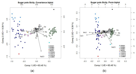 Figure 7. Covariance (a) and form (b) biplots of the principal component analysis using the singular value decomposition of the double-centred clr-transformed sub-composition Na2O, MgO, Al2O3, SiO2, K2O, CaO, TiO2, V, Cr, MnO, Fe2O3, Ni, Zn, Ga, Rb, Sr, Y, Zr, Nb, Ba, Ce, and Th.