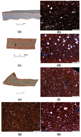Figure 8. Fabric PHIM01a: macrophotograph (a) and photomicrograph in XP (b) of individual HIM178; fabric PHIM01b: macrophotograph (c) and photomicrograph in XP (d) of individual HIM078; fabric PPAR01: macrophotograph (e) and photomicrograph in XP (f) of individual PAR002; photomicrograph of DHIM01 (g) and DPAR01 (h) fired at 850 °C.