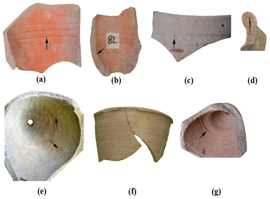 PE allows hypotheses to be drawn regarding formation [69,70], although macroscopic observations are, in this case, most suited due to the large size of these vessels. Individuals of PHIM01-CGHIM01 seem wheel-thrown (Figure 8b), probably in segments; in some cases, the joint of the section is visible by the change in the preferred orientation of voids and inclusions. These features can be better observed macroscopically for the clear traces of a wheel on the body (Figure 10a), and by areas of depressions in the vessel’s body (so-called Y marks) [63] on the possible junction with the rim part (Figure 10c). Moreover, the bottom part of the cones shows a variation of thickness towards the hole, probably due to the fact that the bottom part was thrown upside down (Figure 10b). External cordons seem rolled up and outwards from the rim (Figure 10d). Strong orientations of voids and inclusions that may be due to wheel throwing were found in a few individuals grouped in fabric PPAL01 (especially BAD001-007), but the majority show no to poor preferred orientation of voids and inclusions. Moreover, individuals in PPAR01 show poor orientation of voids and inclusions. Macroscopically, these individuals show uneven wall thicknesses along the two sides of the cones, in addition to traces of the wheel on the surface, suggesting the use of hand-forming methods and possibly rotary devices only for finishing (Figure 10d,e); holes are not always centred and also here there are signs of the bottom part being added (Figure 10f), probably upside down as a variation in thickness towards the hole can be observed. A systematic study of the forming traces coupled with experimental reproduction will support these initial hypotheses.