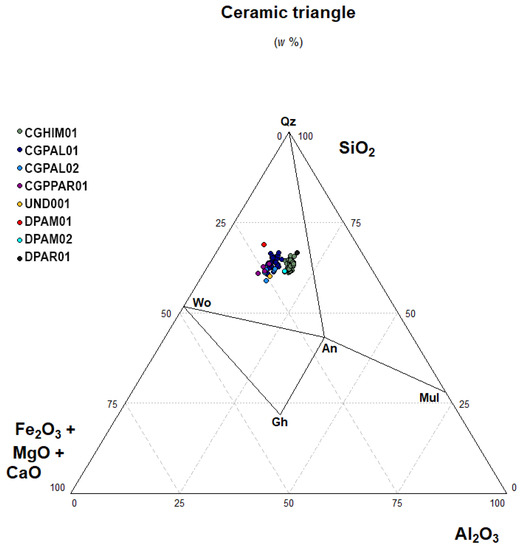 In order to contribute to the knowledge of technical aspects of the production of the artefacts considered in this study, chemical results show that the analysed individuals are ceramics considered as being calcareous (5–6% < CaO < 20–25%). Accordingly, calcareous ceramics commonly develop high-temperature phases and a light microstructure with a progressive formation of a vitreous phase [65,92,93]. The ceramic phase triangle (CaO + Fe2O3 + MgO)-Al2O3-SiO2 (Figure 11) shows how all the individuals analysed in this study are positioned in the quartz–anorthite–wollastonite triangle, which is characteristic of calcareous ceramics. With this in mind, mineralogical and microstructural characterisation is explained below based on the chemical and petrographic results. The complete set of XRD diffractograms and SEM photomicrographs was previously published [94,95].