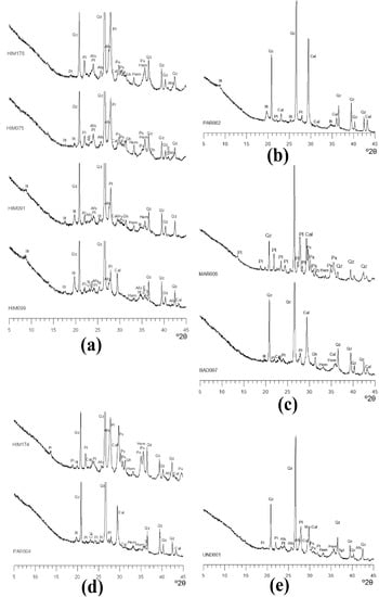 Figure 12. Diffractograms of some of the archaeological individuals discussed by the chemical groups. (a) CGHIM01: individual HIM099, F1; individual HIM091, F2; individual HIM075, F3; individual HIM178, F4. (b) CGPAR01: individual PAR002, F1. (c) GCPAL01: individual BAD007, F1; individual MAR006, F2. (d) GCPAL02: individual PAR004, F1; individual HIM174, F4; (e) individual UND001. Afs: alkali feldspars; Cal: calcite; Gh: gehlenite; Hem: hematite; Ilt: illite-muscovite; Hem: hematite; Mg-Cal: magnesium calcite; Pl: plagioclase; Px: pyroxene; Qz: quartz; Spl: spinel (abbreviations according to [96]).