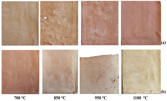 Figure 14. Experimental briquettes of DHIM01 (a) and DPAM01 (b) fired at different temperatures.