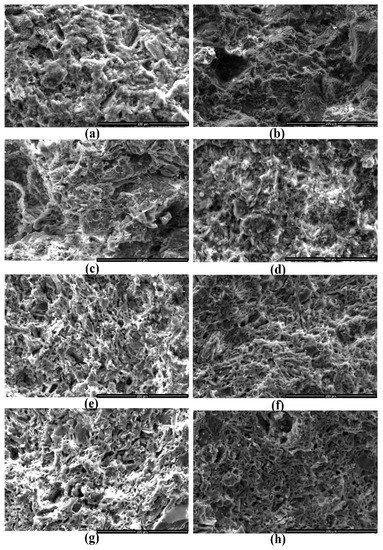 Figure 15. SEM photomicrographs (SE) of the microstructure developed by the experimental briquettes of the two geological deposits sampled: (a) DHIM01 and (b) DPAM01 fired at 700 °C showing an NV microstructure; (c) DHIM01 and (d) DPAM01 fired at 850 °C, IV microstructure; (e) DHIM01 and (f) DPAM01 fired at 950 °C, Vc microstructure; (g) DHIM01 and (h) DPAM01 fired at 1100 °C, TV microstructure. Magnification: ×2000.