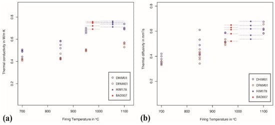 As expected, the fired geological deposit samples presented thermal conductivities correlated with the firing temperature (Figure 17). This can be explained by the densification of the ceramic matrix during firing and the increasing degree of vitrification (Figure 15) [19]. The specimens of the fired geological deposit sampled close to Himera–Buonfornello (DHIM01), however, presented higher thermal conductivity compared to the fired geological deposit from Palermo (DPAM01), particularly at firing temperatures of above 950 °C. This might be related to the higher CaO content in the paste from Palermo, which apparently results in a higher porosity of the ceramic fabric. The two archaeological individuals measured, HIM178 (CGHIM01, F4) and BAD007 (CGPAL01, F1) presented thermal conductivity values at a level comparable to that of the Himera clay (DHIM01) fired at 1100 °C. Although the EFT of BAD007 is estimated to be lower on the basis of the mineral phases developed, the micromorphology observed under the SEM of both the archaeological samples (Figure 13d,f) resembles the micromorphology of the Himera clay fired at 1100 °C. The thermal diffusivity, which describes the rate of heat transfer, indicates a similar correlation with firing temperature, although in the case of the clay from Palermo (DPAM01) the specimens fired at 950 and 1100 °C are at the same level as the fired clay from Himera (DHIM01). Hence, ceramics fired from these two clays will transfer heat at the same rate, which concerns, for example, the capability to withstand thermal stress and thermal shock, or the rate at which the content of the vessel exchanges heat with the environment.