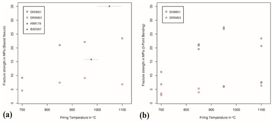 Figure 18. Fracture strength measured in the fired clay specimens and in the two archaeological individuals HIM178 and BAD007: the values are plotted versus firing temperature and the EFT estimated for the two archaeological individuals. The left plot presents the results of the biaxial flexure tests (a) and the right plot the results of the 3-point bending tests (b). Raw data are available in [106].