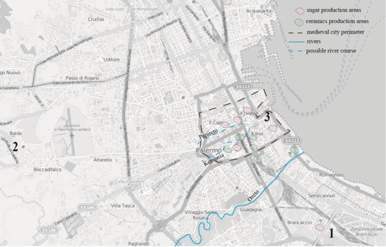 (1) The Castello della Favara in Maredolce (MAR), in Palermo, was built with the artificial lake by the Norman king Roger II; in the 14–15th centuries, the building changed its function from residential to agricultural/industrial, and was also linked with sugar cane production [30] (p. 473) [28] (p. 113). Here sugar pots were found during the excavation of a filling of the lake of Maredolce [30,31]. They were dated to an earlier phase of sugar production and consumption, before the end of the 13th century [16].