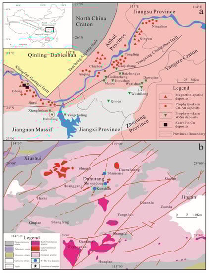 (a) Distribution of ore clusters (districts) in the Middle and Lower Yangtze River metallogenic belt and deposits in the Jiangnan tungsten belt (the insert shows the general tectonic divisions of China, the black rectangle indicates the position of (a) and the circled triangle represent the location of the Dahutang deposit.) (modified after []); (b) Sketch geological map of the Dahutang tungsten polymetallic mine region and the surrounding area in northwestern Jiangxi Province, South China (modified after []).