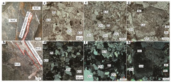 In recent years, many tungsten deposits have been discovered in the Jiangnan Massif and its neighboring area []. So far, the proven tungsten resources in the Jiangnan tungsten belt are nearly 6.06 Mt, of which 1.07 Mt are in Dahutang [,]. The Dahutang tungsten deposit is located in the northwestern part of Jiangxi Province, at the junction of Wuning, Xiushui and Jingan counties (Figure 1b). The mine region mostly exposes Neoproterozoic Shuangqiaoshan Group shallow metamorphic rocks that are heavily laminated, with a general north-east orientation and a south–south-east trend, with a dip angle of 60° to 80° [,,]. The granite group in the mine region is very well developed and consists mainly of Neoproterozoic granodiorite and Early Cretaceous granite []. The former is produced as a base, and the latter is produced as a small strain, tuber or wall (vein) []. The Yanshan-age igneous rocks of the Dahutang tungsten deposit are characterized by a multi-phase intrusion, including medium and fine-grained biotite granite, porphyritic muscovite granite and a small amount of granite porphyry [,,,]. They intruded the Neoproterozoic granodiorite body and developed strong tungsten mineralization in the inner–outer contact zone []. The mineralization type of the Dahutang deposit is mainly fine-vein dipping scheelite (wolframite) where scheelite and wolframite co-exist, accompanied by other types of quartz vein, altered granite, greisen and hydrothermal breccia [,,]. The Jiningian pluton, which mainly consists of granodiorite, is part of the Jiuling batholith. It occurs throughout the mine region and is in close contact with the ore body (Figure 1b). Under the microscope, minerals such as quartz, biotite, potassium feldspar and andesine can be seen, as well as albite and sericitic alteration (Figure 2). The quartz is semi-automorphic, with a grain size of about 0.5 mm, accounting for about 50% of the total rock (Figure 2). The biotite is flaky and has a high interference color, accounting for about 10% of the total rock. The K-feldspar is approximately 1 mm in grain size, where significant sericitization occurs (Figure 2d). The albite is characterized by polysynthetic twin, mostly around the potassium feldspar (Figure 2c–f). Andesine is characterized by weak ring banding and has a larger grain size of up to 2 mm (Figure 2g,h).