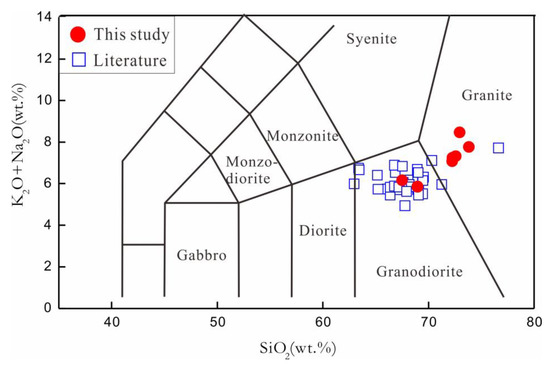 TAS diagram of rock classification of Jiningian granodiorite in the Dahutang deposit (modified after []). Previous data from [,,,], as shown in Supplementary Table S2.