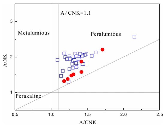 Diagram of Al saturation index of Jiningian granodiorite in the Dahutang deposit (modified after []). Previous data from [,,,], as shown in Table S2.