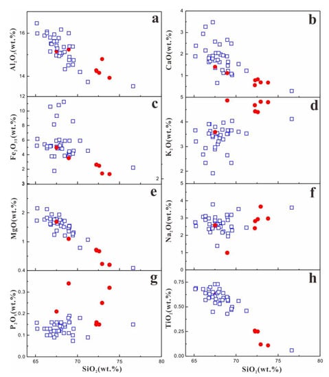 Major element Harker diagrams for Jiningian granodiorite in Dahutang deposit. (a) Al2O3 vs. SiO2; (b) CaO vs. SiO2; (c) Fe2O3T vs. SiO2; (d) K2O vs. SiO2; (e) MgO vs. SiO2; (f) NaO2 vs. SiO2; (g) P2O5 vs. SiO2; (h) TiO2 vs. SiO2. Previous data from [,,,], as shown in Table S2.