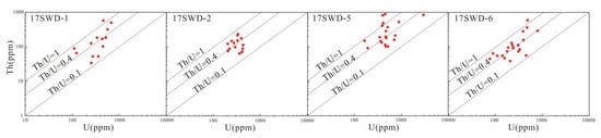 Th, U content and Th/U ratio of different zircon samples in the Dahutang deposit.