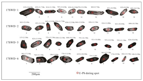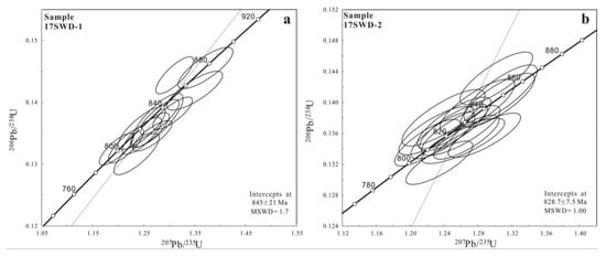 In the CL diagram, most zircon grains are greyish white, long columnar, about 150 to 250 μm long, with a length/width ratio of about 1:3. However, the Th/U ratio of zircons ranges from 0.12 to 2.06, plenty of which are less than 0.4 (Figure 6), indicating that these zircons are not of typical magmatic origin []. Some zircons have oscillatory zonation inside but dark rims as well, especially zircons in granodiorite samples 17SWD-5, 17SWD-6 (Figure 7). The upper intersection ages of the zircon samples 17SWD-1, 17SWD-2 are 845 ± 21 Ma (MSWD = 1.7) and 828.7 ± 7.5 Ma (MSWD = 1.0), respectively (Figure 8). Harmonic plots were not plotted as the data points for some samples of 17SWD-5 and 17SWD-6(such as 17SWD-5-2, 17SWD-6-3, 17SWD-6-15 in Figure 7) deviated from the U-Pb harmonic line. Zircon U-Pb dating results are presented in Supplementary Table S3.
