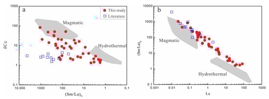 Zircon genetic discriminant diagrams for the Dahutang deposit (Modified after []). Previous data from []. (a) (Sm/La)N vs. δCe and (b) La vs. (Sm/La)N.