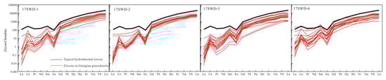 Zircon is a geochemically stable accessory mineral with a high U-Pb closure temperature [,]. However, zircons are susceptible to alteration under fluid interaction, bringing “hydrothermal mineral” characteristics to the original zircons, called “hydrothermal zircon” [,,,,]. Hydrothermal fluids account for zircon edges, resulting in the rounding of zircon grain edges or the appearance of other corrosion structures and altering the trace element characteristics of zircon. Moreover, the formation of the wide alteration edge and the reset of zircon U-Pb systems can also be caused by hydrothermal alteration [,].