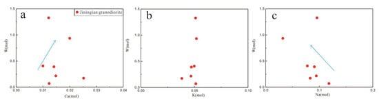 Ca-W, K-W and Na-W correlation diagram. The molarity of Ca, K and Na is obtained by dividing the major and trace elements (CaO, K2O, Na2O and W) by their respective relative molecular or atomic masses. (a) Ca vs. W, (b) K vs. W and (c) Na vs. W. The blue arrow indicates the trend of correlation.