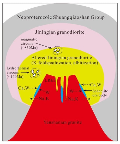 For massive development of fine-vein dipping scheelite in the Jiningian granodiorite, two conditions must be met: firstly, sufficient tungsten in the mineralizing fluid and, secondly, a large amount of calcium in the fluid []. For the source of the mineralizing fluid, evidence from hydrogen, oxygen isotopes of H2O in fluid inclusion and wolframite oxygen isotopes reveal that it is derived from Yanshanian magma, and trace element studies of scheelite prove the addition of Jiningian granodiorite in the late evolution of mineralizing fluids [,]. The development of many alteration types such as the potassic and sodic alteration in our samples (Figure 2), together with the firstly reported Yanshanian hydrothermal zircons, verifies the strong material exchange between the mineralizing fluids and Jiningian granodiorite. Under the influence of Yanshanian hydrothermal fluids, the calcium-rich plagioclase in the Jiningian pluton de-composed, releasing large amounts of Ca2+ into the hydrothermal fluids and taking part in the formation of scheelite []. In this process, part of the W in the Jiningian pluton is also released into the hydrothermal fluid, which can be proven by the positive correlation of W and Ca in Jiningian granodiorite (Figure 11a). However, the disintegration of plagioclase does not result in the release of W into the fluid. According to the study before, the alkaline account, such as K-feldspathization and albitization, can further activate the transfer of tungsten, which is important for tungsten mineralization, while rocks with alkali feldsparization show depletion of W []. There is a wide range of variation in the W content of our samples (13–172 ppm, Table S1), the depletion of W in part of our samples may result from the alkali feldsparization. The significant negative correlation between Na and W and no correlation between K and W (Figure 11b,c) indicates that albitization is the major mechanism of releasing W [].
