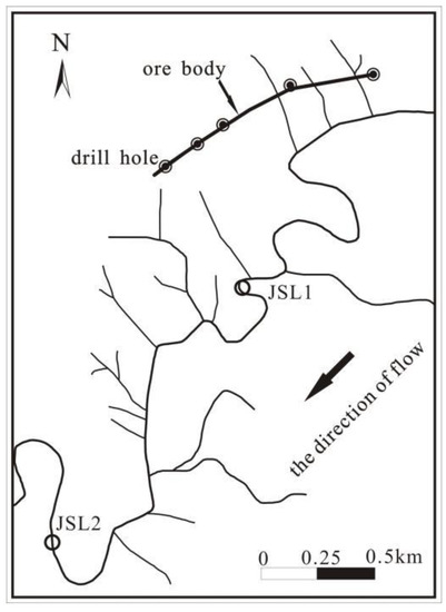 The test samples used to determine the optimal sampling particle size fraction for stream sediment geochemical survey were collected along the stream below the W–Mo polymetallic deposit and with stream sediment geochemical anomalies. The JSL1 and JSL2 sampling points are located downstream of the deposit; the JSL1 sampling point is about one kilometer from the deposit (Figure 2).