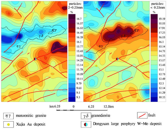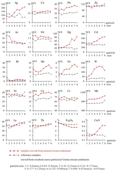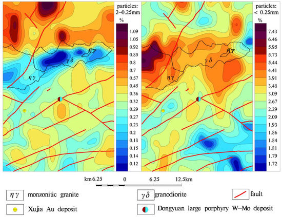Therefore, the results of the stream sediment geochemical survey in the pilot area proved that using the 2–0.25 mm particle size fraction of samples was better than using the <0.25 mm particle size fraction of samples, especially in the aspect of ore-prospecting and delineating geological bodies. The probable major causes for this finding are the two following points.
