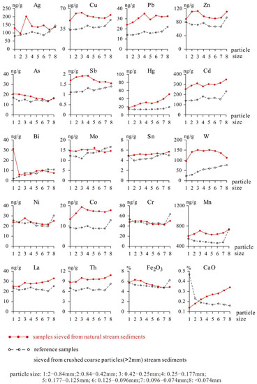 China’s National Geochemical Mapping Project (Regional Geochemical-National Reconnaissance, RGNR project) initiated in 1978 [1] has now covered more than 6 million square kilometers of China’s territory, which contributed significantly to China’s mineral exploration. Particle size exerts significant control on the concentration of elements in stream sediments; therefore, it is critical to stream sediment-based geochemical exploration, which is important in the RGNR project [2,3].