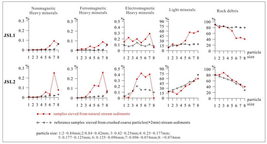 As shown in Figure 5, the distribution of minerals in the natural sieved samples are as follows. (1) As the particle sizes of sediments become smaller, the amount of nonmagnetic heavy minerals, ferromagnetic heavy minerals, electromagnetic heavy minerals, and light minerals increases gradually, whereas rock debris shows a decreasing trend [4,14,58,59]. (2) In the 0.177–0.096 mm particle size fraction (category 6 in Figure 5), most of the heavy minerals are separated, and the rock debris are almost replaced by the four mineral groups. A small amount of rock debris exists in this fraction of sediments, mainly because there is slate, phyllite, and shale in the study area. (3) Electromagnetic heavy minerals are separated well from 0.42–0.25 mm particle size fraction (category 3 in Figure 5), which is relevant to pyrite and hematite–limonite with large particles. (4) Light minerals show a sharp increasing trend from coarse to fine particle sizes, and with relatively low weight percentage in the 0.42–0.25 mm particle size fraction (category 3 in Figure 5). (5) The species and amount of minerals in the samples from JSL2 are higher than that in the samples from JSL1. This indicates that the samples from downstream were carried over a longer distance and the minerals in the downstream samples were separated at a high level. (6) The >0.25 mm fraction of sediments (category 1 + 2 + 3 in Figure 5) are mainly composed of rock debris. The <0.25 mm particle size fraction of sediments (categories 4–9 in Figure 5) has large quantities of minerals separated from rock debris.