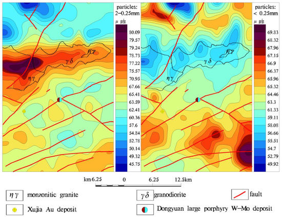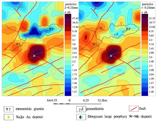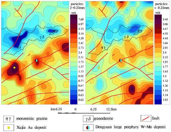 The geochemical maps of Au of the two studied size fractions exhibit a couple of significant contrasting features (Figure 10). Firstly, the geochemical anomaly intensity and scale delineated by the 2–0.25 mm particle size fraction of samples are better than those by the <0.25 mm particle size fraction of samples. Secondly, a deposit-related anomaly of Au with high intensity was delineated in the area by using the 2–0.25 mm particle size fraction samples. This Au anomaly later led to discovery of a new gold deposit. However, no deposit-related Au anomaly was delineated by using the <0.25 mm particle size fraction of samples.