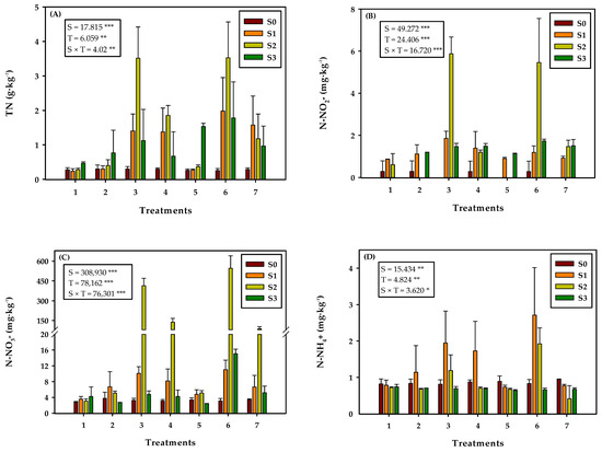 Mean concentration of TN (A), N-NO2− (B), N-NO3− (C) and N-NH4+ (D) in the different treatments (1–7). 1: control; 2: limestone and biochar; 3: limestone and compost; 4: limestone, biochar and compost; 5: biochar, limestone and zeolite; 6: limestone, compost and zeolite; and 7: limestone, biochar, compost and zeolite. S0: sampling 0, S1 sampling 1, S2: sampling 2; and S3: sampling 3. Error bars denote standard deviation (n = 3). F values and significance of the two-way repeated measures ANOVA are shown in each graph. S: sampling; T: treatment. Significant at * p < 0.05, ** p < 0.01 and *** p < 0.001; ns: not significant (p > 0.05). (A) Mean concentration of TN in the different treatments (1–7). (B) Mean concentration of N-NO2− in the different treatments (1–7). (C) Mean concentration of N-NO3− in the different treatments (1–7). (D) Mean concentration of N-NH4+ in the different treatments (1–7).