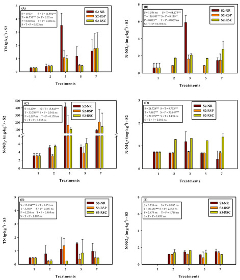 The TN content was significantly higher in the NRS than in the RS in S2 for both species—1014 mg·kg−1 and 800 mg·kg−1, respectively—as well in S3, with 971 mg·kg−1 for NRS and 500 mg·kg−1 for RS. There was a significant effect of the treatment factor (T) in the S2 and S3 samplings whereas the interaction of the soil type × T was only significant in S2 (Figure 4A,E). The treatments 3, 5 and 7 showed the highest TN values, likely due to the compost application. It is important to note that the plant species were not significant for the TN variation in either S2 or S3.