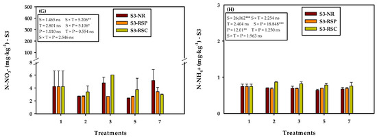 Regarding the type of plant, in S2, significant differences were observed in the concentrations of N-NO2− in the rhizosphere soil of C. juncea, which acted as a nitrogen-fixing species and reported a higher concentration in all treatments except in treatment 1 (control). However, in S3, significant differences were only observed between the treatments and not between the soil types or species (Figure 4F). This might have been due to the lower concentrations of N-NO2− presented by treatment 1 (control) compared with the other treatments (with amendments) that presented similar concentrations because N-NO2− originates mainly from organic amendments (in this case, the compost and biochar).