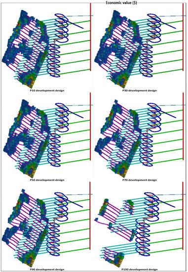 - Abdel Sabour, S.A.; Dimitrakopoulos, R.; Kumral, M. Mine design selection under uncertainty. Min. Technol. 2008, 117, 53–63. [Google Scholar] [CrossRef]