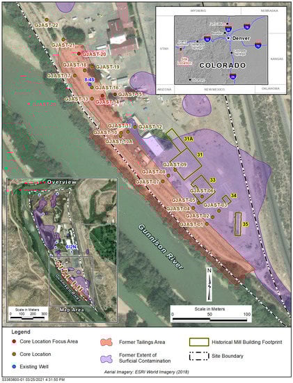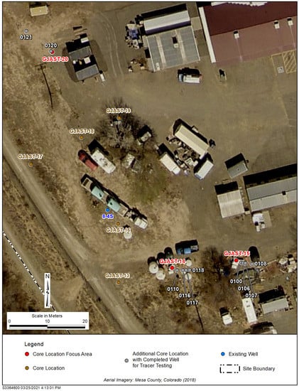 The GJO site had several uranium pilot mills operated by the U.S. Army Corps of Engineers Manhattan Engineer District from 1943 to 1958 []. These pilot mills were used to develop uranium extraction methods to provide uranium for the first nuclear weapons produced in the United States. Uranium tailings were deposited in low areas near the pilot mills along the Gunnison River [] (Figure 1). The groundwater at the site is strongly controlled by the Gunnison River stage in the point bar setting shown in Figure 1, with a depth to bedrock of up to 9.8 m []. The uranium mill tailings were present for several decades before the majority of the material was removed between 1989 and 1994 and transferred to an engineered disposal cell [], with the excavation of contaminated material to depths that met radiological standards—radium levels below 5 picocuries per gram (pCi/g) (plus background) in the top 15 centimeters (cm) of sediment and below 15 pCi/g (plus background) in deeper sediment. Even though radiological standards were met across the site, some areas had near-surface, solid-phase uranium concentrations that were above background []. Using [] as a guide, additional solid-phase sediments were collected at multiple coring locations reaching bedrock underneath a former tailings area (Figure 1). The analyses of these sediments identified additional zones with elevated uranium concentrations []. The authors of [] provide mineralogic data on the uranium associations in the solid phase for some of these coring locations. The GJO site does not have a distinct groundwater uranium plume due to the changing groundwater flow directions controlled by the Gunnison River stage and the spotty nature of uranium tailings distributed in low spots across the site []. Recent uranium concentrations (1996 to 2021) in the area of interest (well 8-4S in Figure 1) have ranged from 0.097 to 0.73 milligrams per liter (mg/L). A more detailed site history, relevant site documents, and LTS&M data reports can be found at https://www.energy.gov/lm/grand-junction-colorado-site (accessed on 27 March 2022).