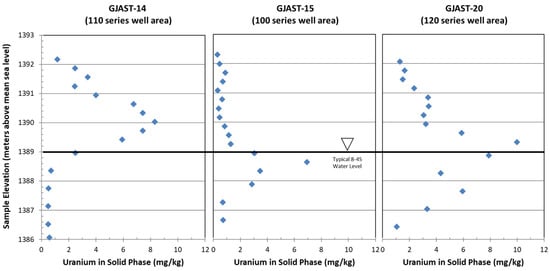 GJAST-14, -15 and -20 (locations in Figure 1) uranium concentrations with depth (National Geodetic Vertical Datum of 1929) for 5% nitric acid extraction. Typical water table for all three locations is 1389 m. Original data are from [].