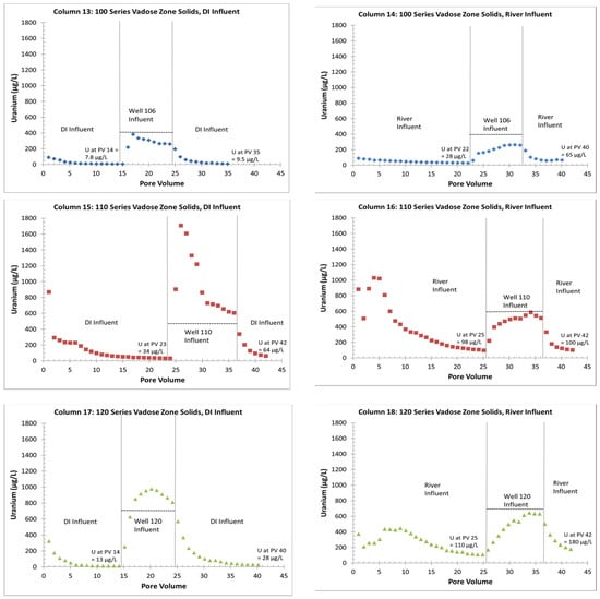 In general, greater concentrations of calcium and alkalinity keep more uranium in solution, although the exact amount depends on the pH and other constituents in solution, such as magnesium []. The column effluent data indicate that calcite was greater than or equal to its equilibrium solubility (calcite SI > 0 in Files S1 and S5) and that higher calcium concentrations (>400 mg/L) were due to the dissolution of gypsum (gypsum SI near 0 in Files S1 and S5). Gypsum dissolution, as evidenced by high calcium concentrations, was not seen in the 100-series VZ columns but was seen for about six PVs in the 110-series VZ columns and for all the PVs in the 120-series VZ columns (calcium > 400 mg/L in Figure 5).