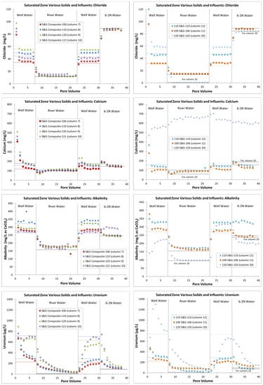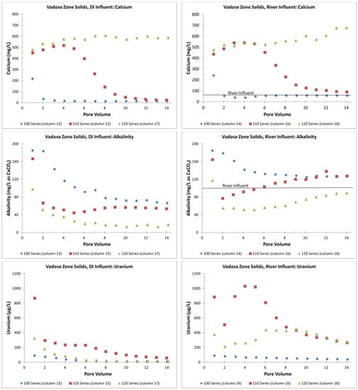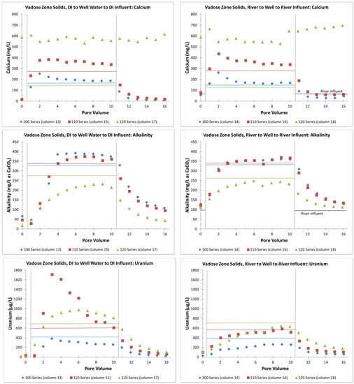 Before switching to the contaminated groundwater influent, the number of PVs for the DI and river influents varied between the different VZ columns (Figure 4); thus, calcium, alkalinity, and uranium are graphed for just PVs 1 through 14 (Figure 5), and then separately for the groundwater influent and the switch back to a DI or river-water influent (Figure 6). In Figure 6, the PV just before the change to the groundwater influent is set to PV 0 for graphing purposes, in order to overlay multiple data sets. Calcium and alkalinity were selected for graphing as they highlight the potential for the formation of calcium uranium carbonate complexes that can keep uranium in solution []. In addition, calcium highlights gypsum dissolution. As a conservative mobility element, chloride indicated little to no dispersion within the columns, as the chloride reached equilibrium with the influent water within 1 to 2 PVs (File S5).