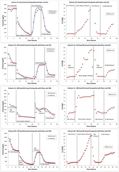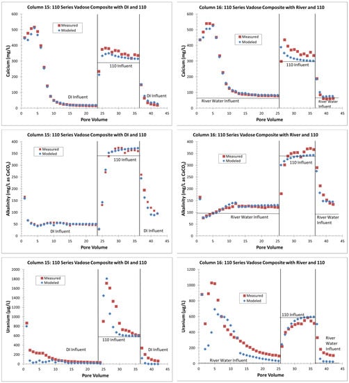 Fitting the initial PVs was usually the most difficult, especially in the columns with initially high uranium concentrations. Because of the carbon dioxide degassing with the influent groundwater and the necessary bubbling of carbon dioxide back into that water to match the field pH values at +/− 0.2 pH units, the pH values of these waters were somewhat uncertain. When testing the sensitivity of this initial pH value, a slight influent pH change within the +/− 0.2 pH units made a dramatic difference in the modeled effluent uranium concentration. Sometimes, a slight influent pH change improved the early PV fits (as in column 12 in Figure 9), but this was not always the case (e.g., column 11 in Figure 9). However, this adjustment did not change the sorption parameters, as these were quite sensitive to fitting the uranium concentration changes after switching to river water and then back to a groundwater influent.